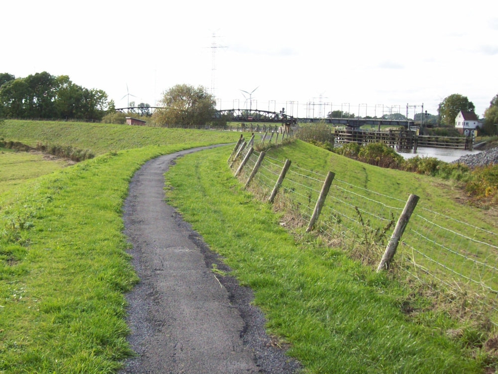 Hinweis: Die Eisenbahnbrücke über die Hunte ist inzwischen aufgrund eines Unfalls sanierungsbedürftig und deshalb bis voraussichtlich 2030 nicht mehr Teil der offiziellen Streckenführung. Alternativ kann man weiter südlich bei Huntebrück den Fluss queren oder über das Huntesperrwerk (Öffnungszeiten beachten!) nördlich von Elsfleth fahren.