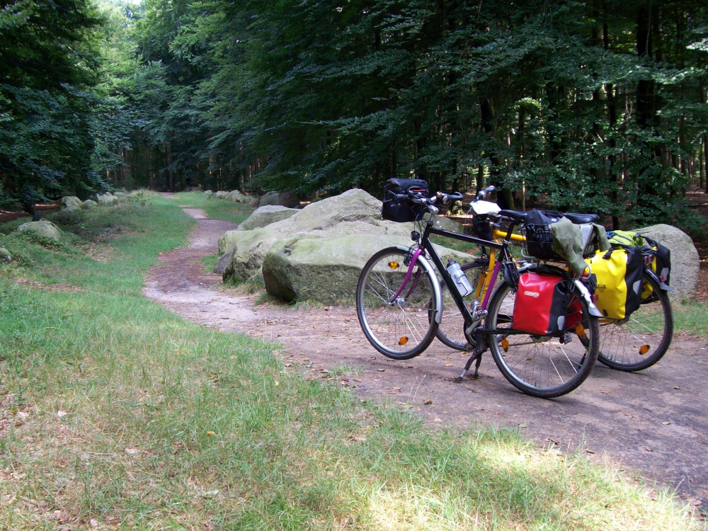 Weiter ging es an einer Eisenbahnstrecke entlang bis nach Oldenburg. Im weiteren Verlauf ging es über Nebenstraße und Feldwege, mit ganz unterschiedlicher Pflasterung . Vor Visbek führte die Strecke auf schmalen Pfaden durch den Wald, bis wir die Großsteingräber erreichten.