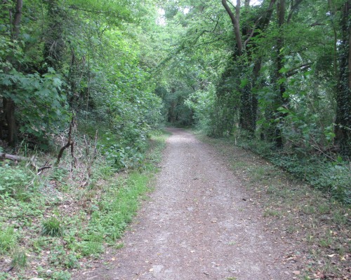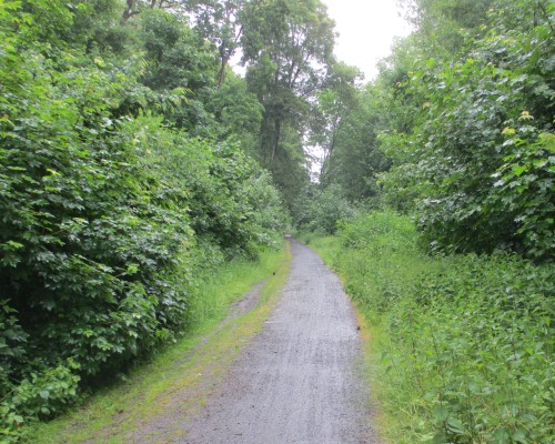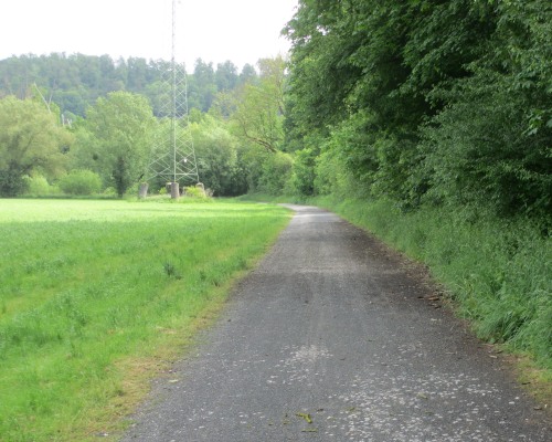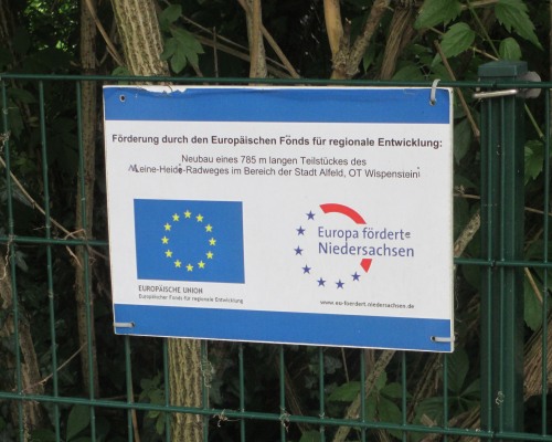 Etwas später führt die Strecke dann entlang einer Bahntrasse. Die offenbar wenig befahrene Bahnlinie stört zwar nicht, ist aber landschaftlich natürlich auch kein Highlight. Entlang der Bahn ging es bis kurz vor Alfeld. Bei Wispenstein verengte sich der zunächst zweispurige Weg bis auf einen schmalen Pfad . Am Ende dieses Pfades wiesen uns Schilder darauf hin, dass diese schlecht befahrbare und grob gekieste Strecke mit der Unterstützung der EU gebaut wurde. Wir haben auf unseren Touren schon Radwege gesehen, bei denen die Gelder der EU deutlich besser angelegt waren.