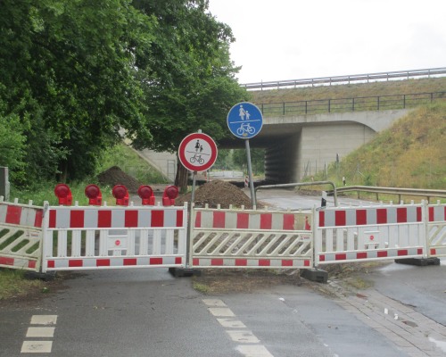 Bei der Unterführung an der A7 trafen wir auf eine weitere Baustelle . Ob es keinen rechtzeitigen Hinweis gab oder wir ihn übersehen hatten ist nicht klar. Da aber aufgrund des Sonntags auf der Baustelle ohnehin kein Betrieb war und neben der Absperrung bereits ein Trampelpfad zu erkennen war, schoben wir unsere Räder wieder einmal vorsichtig durch die Baustelle und sparten uns so einen weiteren Umweg.