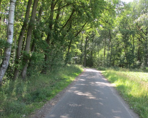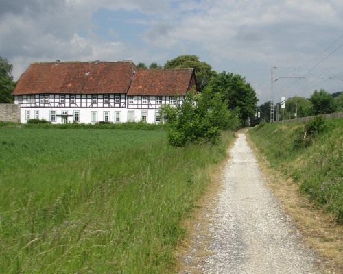 Der Weg führt anschließend weiter durch die Felder, um vor der Autobahn A2 als schmaler Trail durch den Wald zu führen. Hinter der Unterquerung der Autobahn führt die Strecke ca. 3 km straßenbegleitend auf einem Radweg . Leider ist die Straße recht stark befahren und es wird zurecht vor Radwegschäden gewarnt.