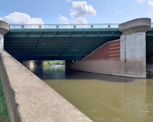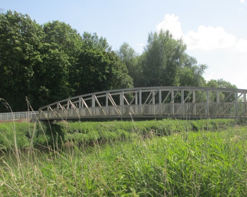 Die Mühe lohnt sich aber, da sich so die Möglichkeit bietet, auf die Mittellandkanal-Brücke zu steigen und von oben einen Blick auf die Leine und die Leineauen zu werfen.