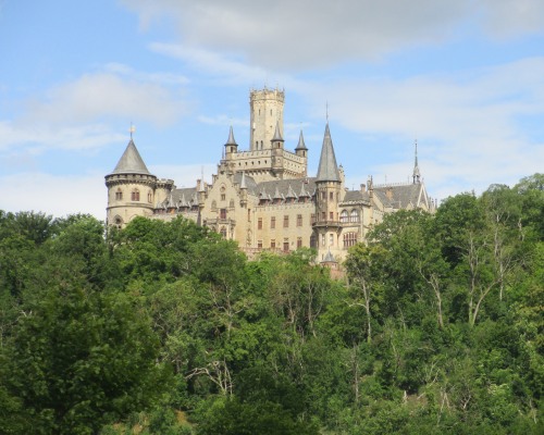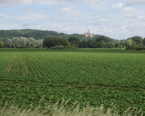 Am nächsten Morgen ging es also zunächst mit der Bahn zurück zum Bahnhof Elze, vor dem uns ein Hinweisschild zu den Radwegen auffiel. Kurz hinter der Ortschaft kann man dann schon die Marienburg in der Ferne sehen.