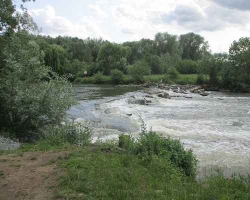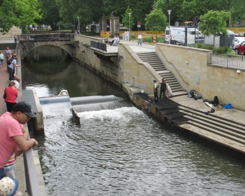 Kurz hinter Göttingen wird der Leine-Radweg über eine Brücke geführt. Diese Querung führt allerdings über eine Treppe (mit 15 Stufen und einer Schieberinne fürs Rad). Andere Radreisende hatten im Internet bereits auf eine Wegvariante hingewiesen. Wir blieben daher zunächst auf unserer Seite der Leine und wurden kurze Zeit später mit malerischen Stromschnellen belohnt.