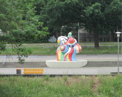 Der Leine folgend erreicht man an der Skulpturenmeile die Nanas . Über die Königsworther Straße führt die Strecke zur gleichnamigen Brücke mit ihren mächtigen Leuchtern. Hinter der Brücke folgt man der Leine nach rechts bis zum Zusammenfluss von Leine und Ihme am Strandleben . Jenseits der Brücke trifft man dann wieder auf den offiziellen Leine-Radweg.