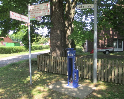 Mitte Juni nahmen wir die Schlussetappe in Angriff und fuhren zunächst wieder mit der Bahn nach Neustadt am Rübenberge. Vom Bahnhof fanden wir schnell wieder auf den Leine-Radweg und entdeckten vor Suttorf diese Radstation .