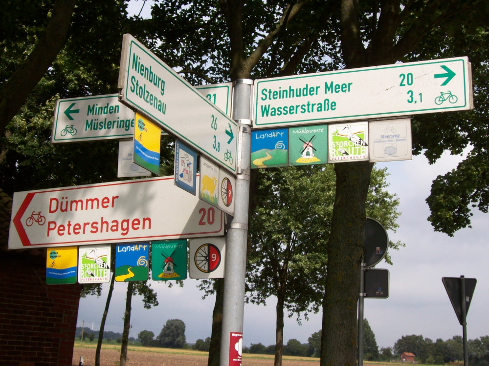 Wegweiser finden sich an fast allen offiziellen Fernradwegen. Deren Menge und Eindeutigkeit ist aber recht unterschiedlich. Grade in größeren Städten verliert man hier leicht die Richtung. Auch die Ausschilderung von möglichen Alternativstrecken kann hier zu Verwirrung führen. Schließlich können Wegweiser auch überwuchert, umgefallen oder verdreht sein. Eine ausschließliche Orientierung anhand der Ausschilderung würden wir deshalb nicht empfehlen.