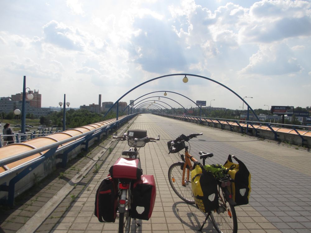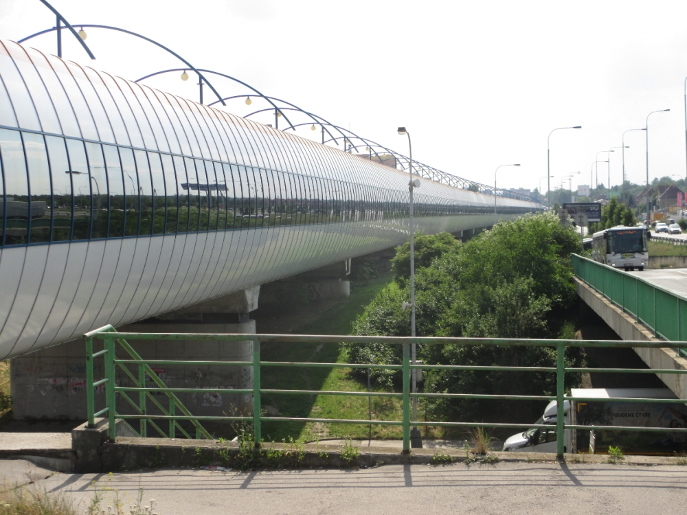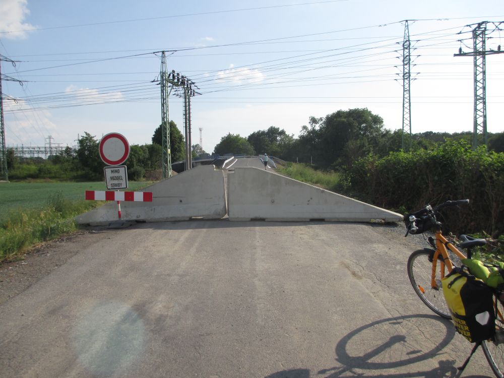 Und schließlich wird die Strecke zum Problem, wenn sie einfach nicht zu finden ist. Kurz vor Prag an diesem S-Bahnhof war der Radweg verschwunden. Rundherum Schnellstraßen, die man mit dem Rad nicht befahren durfte. Die Karte und auch das Navi zeigten aber eindeutig, dass der Weg hier weiterführen musste. Nach längerem Suchen fanden wir den Radweg AUF der S-Bahnröhre , hier fuhren wir dann hoch über dem übrigen Verkehr in Richtung Prager Innenstadt.