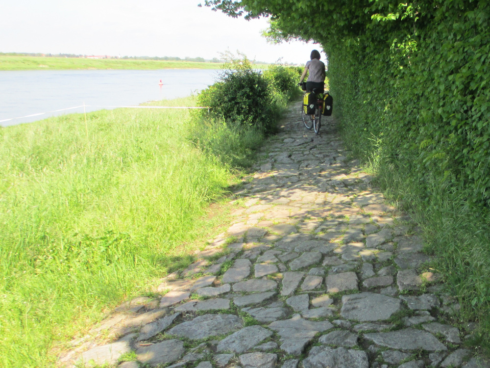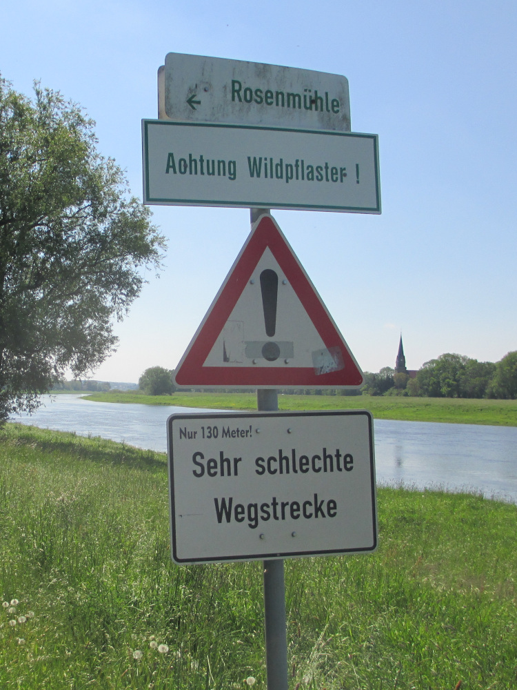 Wege: Der Weg, also die eigentliche Strecke kann sich auch zu einem Hindernis entwickeln, wenn Radfahren z.B. nicht erlaubt ist. Es kommt durchaus vor, dass Fernradwege kurz durch Fußgängerzonen oder über Fußwege geplant werden. Um Ärger zu vermeiden sollte man diese Stücke auch nutzen, um sich kurz die Beine zu vertreten. Manchmal haben die Wege aber auch eine Qualität , die sich nicht wirklich zum Radfahren eignet. Fairerweise wurde dieser Teil der Strecke aber vorher angekündigt .
