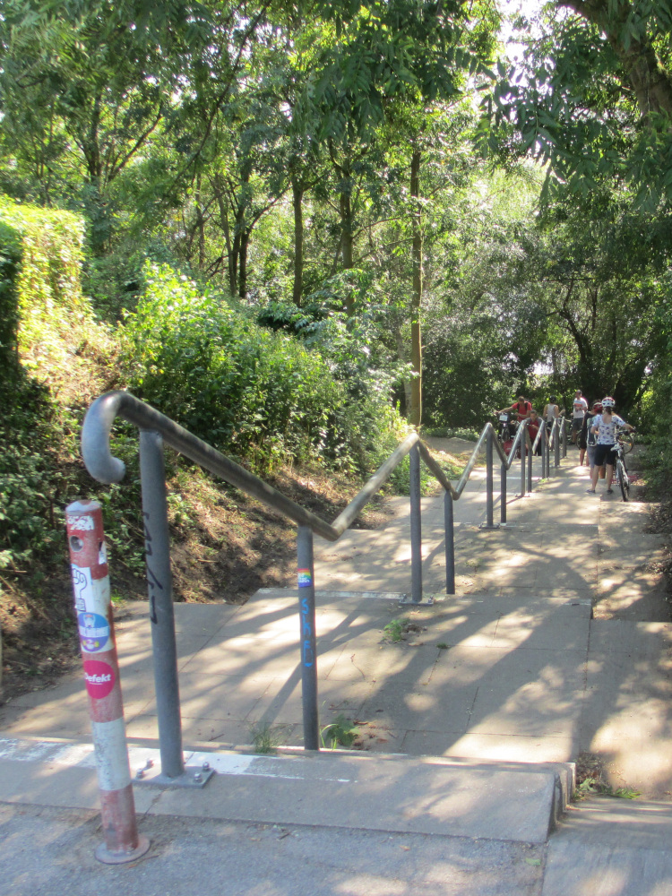 Treppen: Treppen würde man im Normalfall nicht auf auf einem Fernradweg vermuten. Trotzdem kann es vorkommen, dass man unvermittelt mit seinem bepackten Rad vor einer Treppe steht. In manchen Fällen hat man in Form einer Schieberinne an die Radfahrer gedacht. Manchmal ist auch das nicht vorhanden . Wenn die Treppe auf eine höher gelegene Fahrbahn führt ist es manchmal hilfreich nach einem zweiten Aufgang zu suchen, Fahrradauffahrten werden in diesen Fällen meist nur auf einer Seite gebaut.