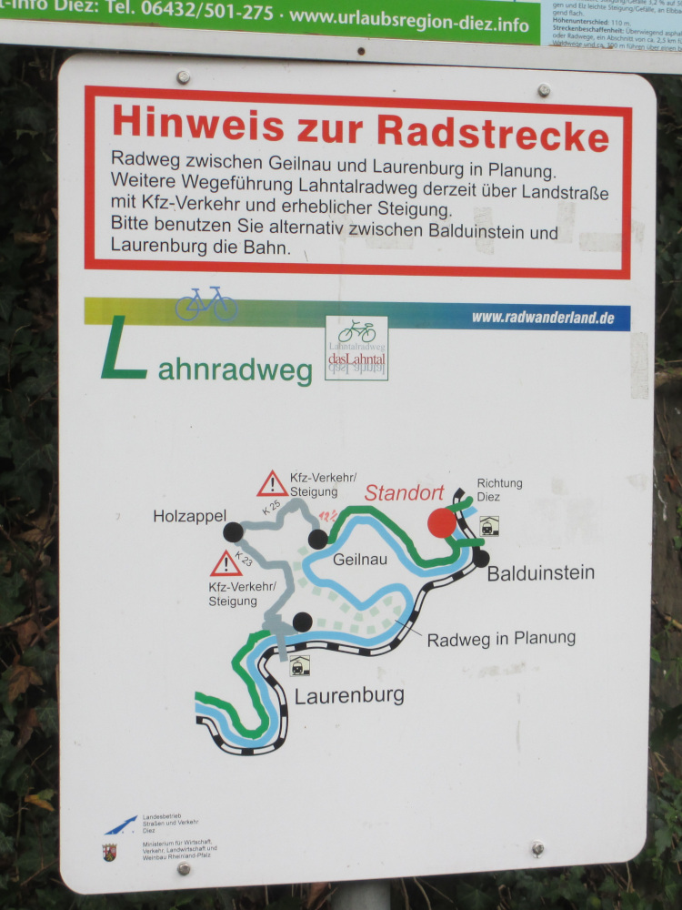Ab und zu stellt sich die Frage ob man den Schildern oder dem Navi bzw. der Karte trauen sollte, sofern sie in unterschiedliche Richtungen weisen. Wir haben gute Erfahrungen damit gemacht neuen (oder neu aussehenden) Schildern den Vorzug zu geben. Bei älteren (verwitterten oder sogar bemoosten) Schildern folgen wir lieber dem Vorschlag des Navis.