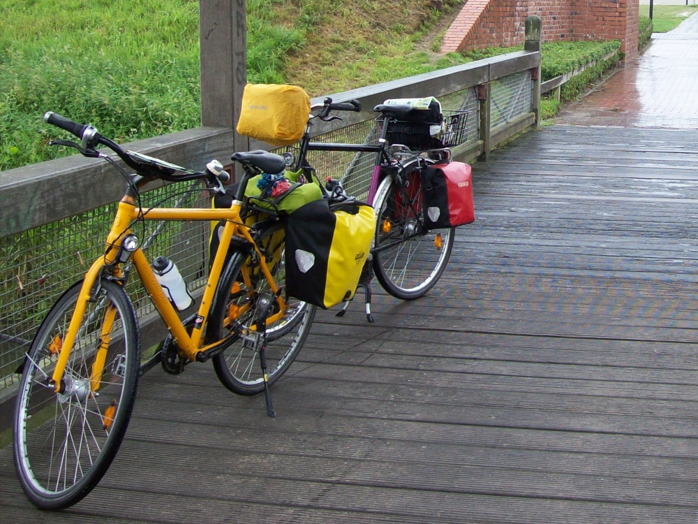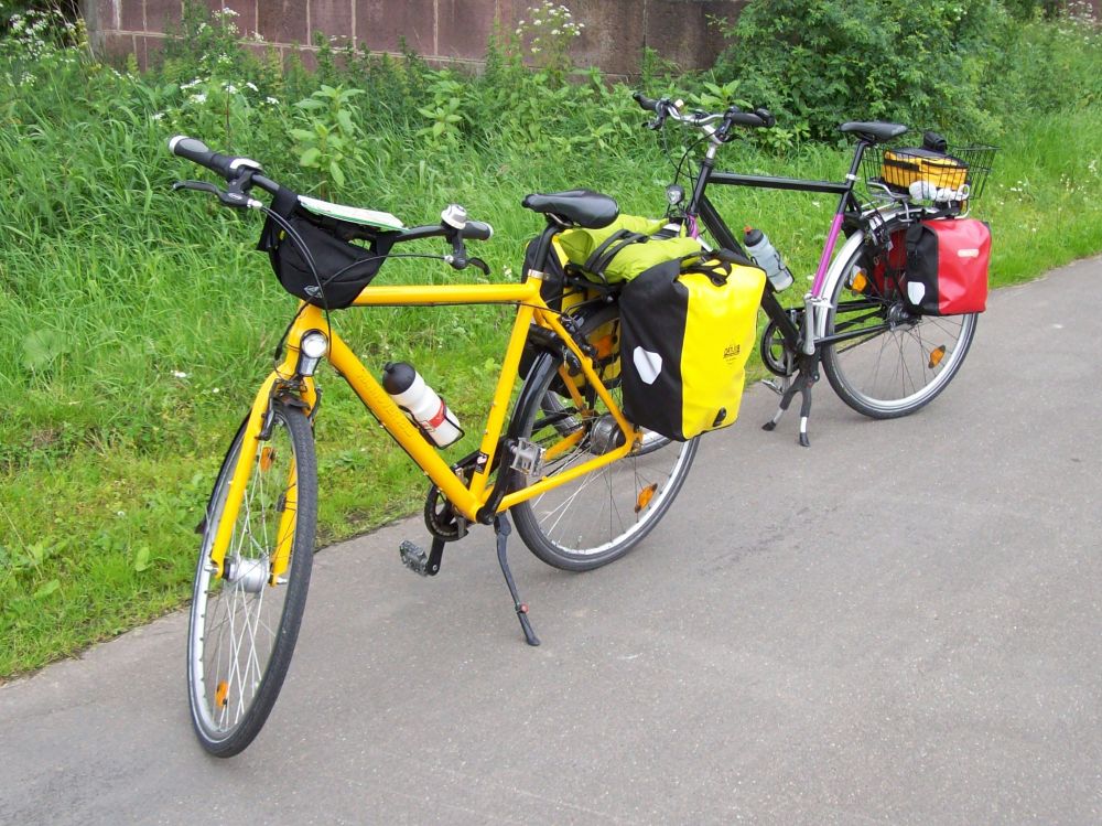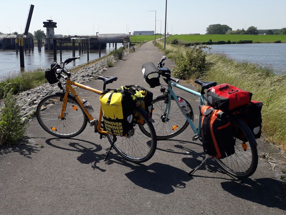 Taschen: Unsere Ausrüstung hat sich über die Jahre verändert. Bei unserer erste Tour an der Weser waren wir noch mit deutlich weniger Stauraum unterwegs, als wir es heute sind. Neben den größeren Taschen sind vor allem die Lenkertaschen und das Fahrradnavi dazugekommen.