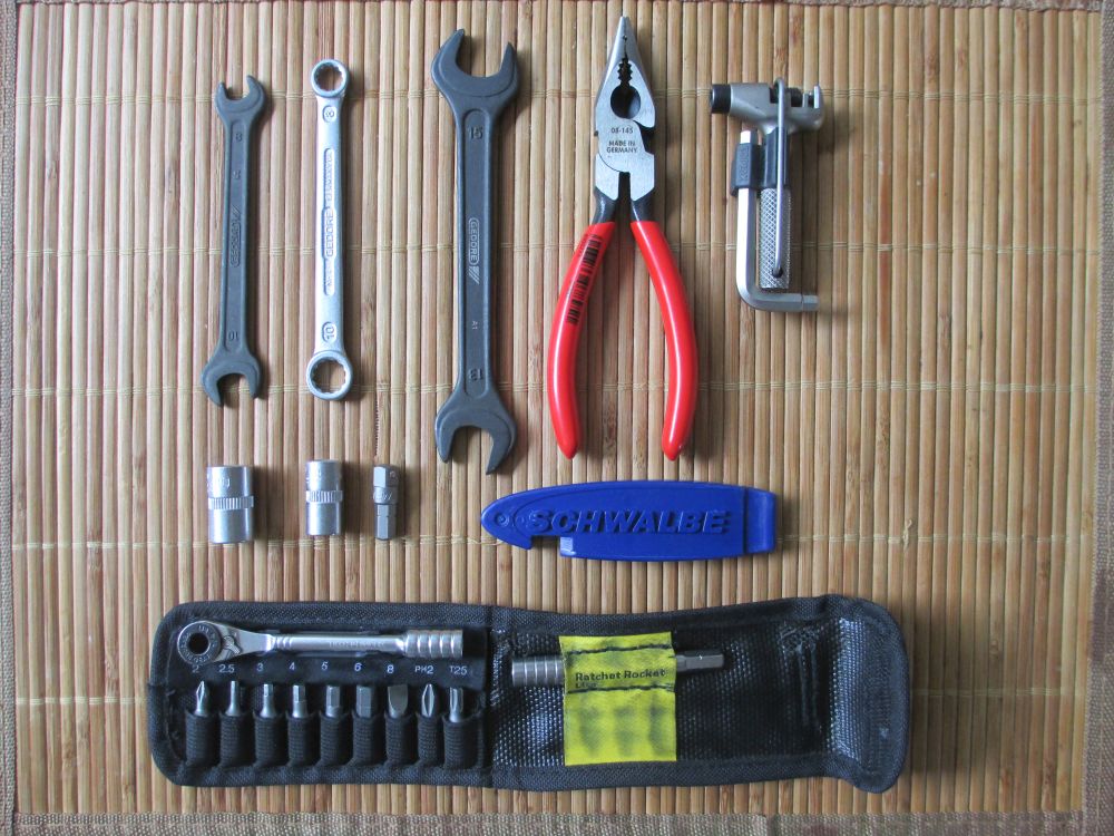 Werkzeug: Generell sollte man vor einer längeren Tour das Rad durchchecken (lassen?). Luft aufpumpen, Kette ölen, Schaltung und Bremsen einstellen und alle Verschraubungen auf festen Sitz überprüfen.